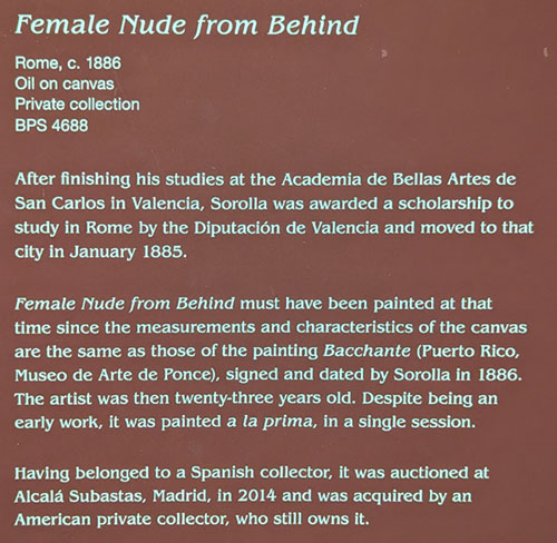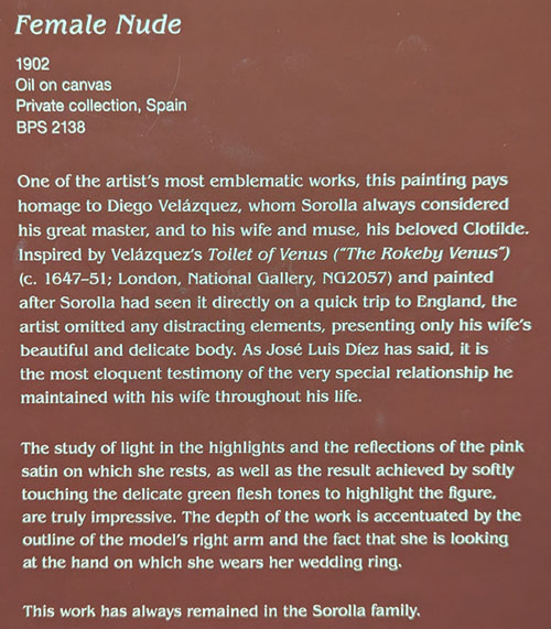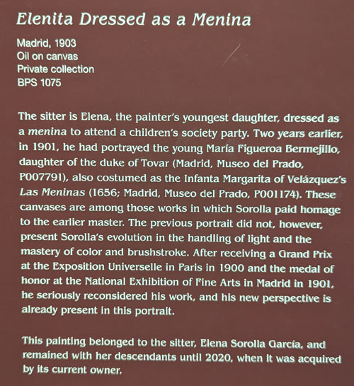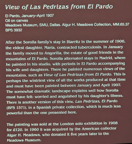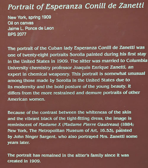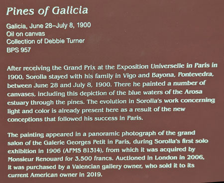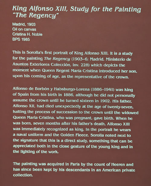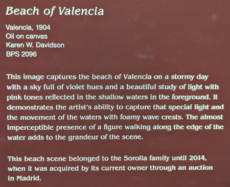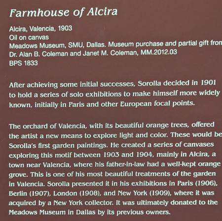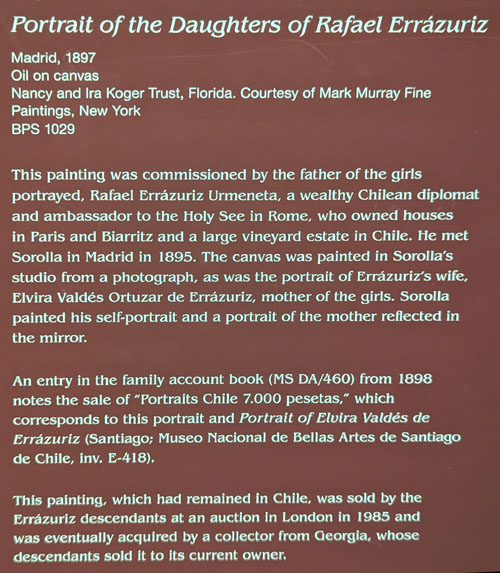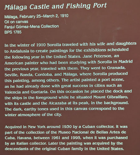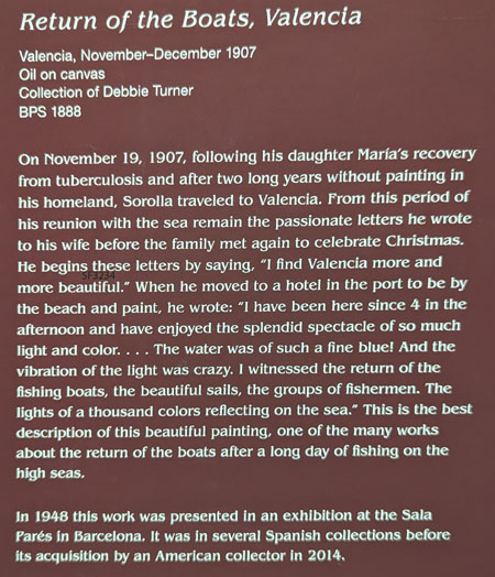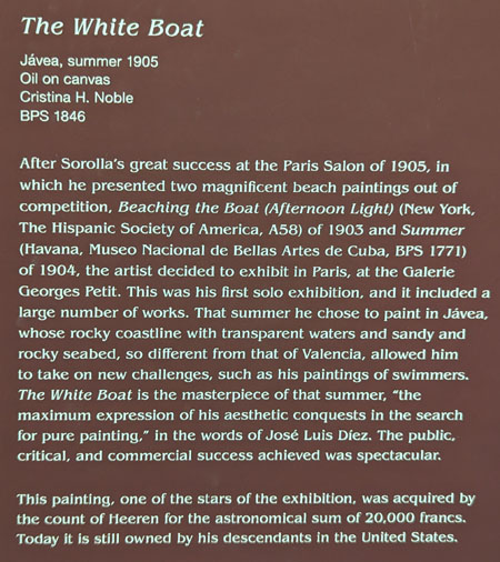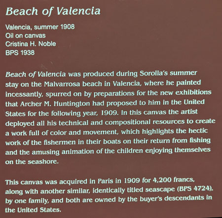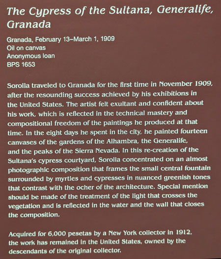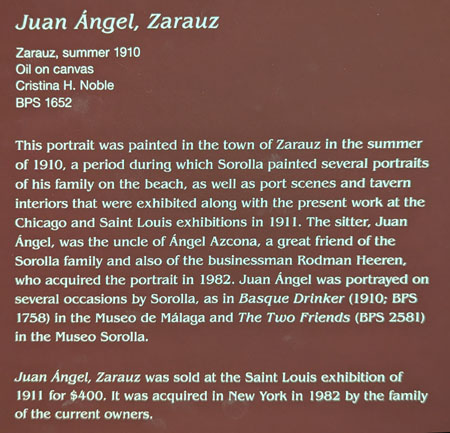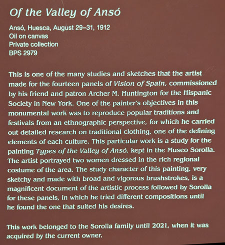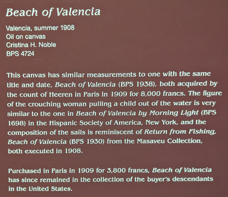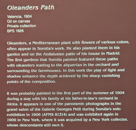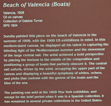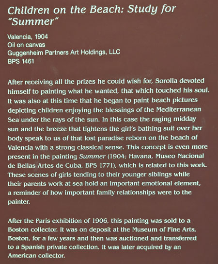 So now what I plan on doing is taking our (well, mostly mine, as I am the photographic "documenter") pictures of the artworks in the exhibit and present them to you pretty much in the order they appeared to us in the exhibit galleries. For each artwork, I'll put a small picture on this page that you can click to enlarge, and I will add such information as was available on the description cards on the wall beside each one. So, here are the artworks from the Sorolla exhibit.