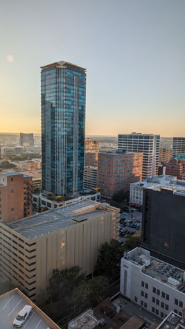 Prudence had asked Fred and I to join them for dinner at the Capital Grille- one of their favorite places there. We met them first on the 24th floor of the Kimpton Hotel where they like to stay. They serve wine at 6PM, so we had a glass and I took a few pictures from the windows: