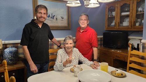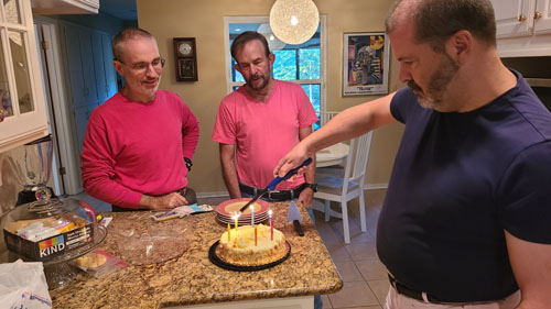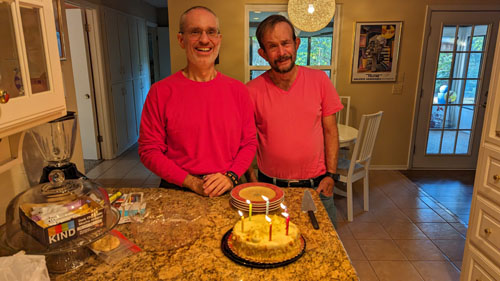 Today we are out at Mario and Steve's house to help Mario celebrate his birthday (which is actually on the 8th). It was just the four of us, and we went out to dinner and then returned to their house for cake. We actually expanded the cake ceremony to include Fred's birthday, which was actually today.