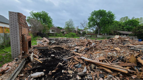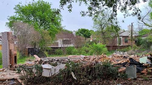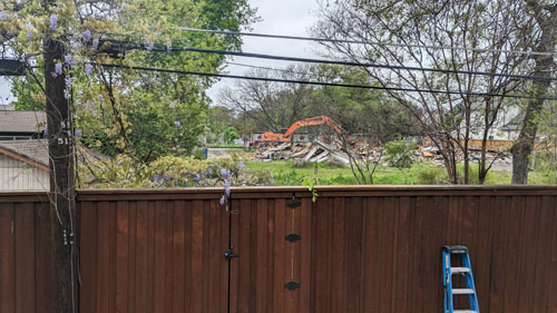 But it took years. Years during which the roof developed a hole or two, some of the large trees in the backyard toppled, and in general the property was something of an eyesore. But that changed in March of this year, when we were surprised to look out the window one morning to see the white house being demolished.