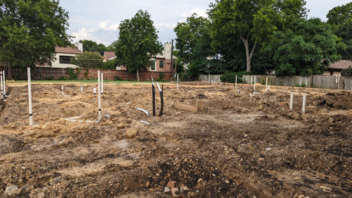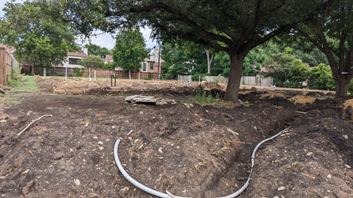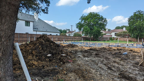 I had no idea that these "trenches" existed, but I have some inkling that they only exist for very large houses (making me wonder whether our own foundation was done similarly). It may be that this technique is a new one, minimizing the use of concrete while maximizing the strength of the foundation. Again, I noticed that there were PVC pipes that ran through the mounds and the trenches, and these will be buried in the concrete when it is poured. How this might impact a needed repair way down the line, I also have no idea.