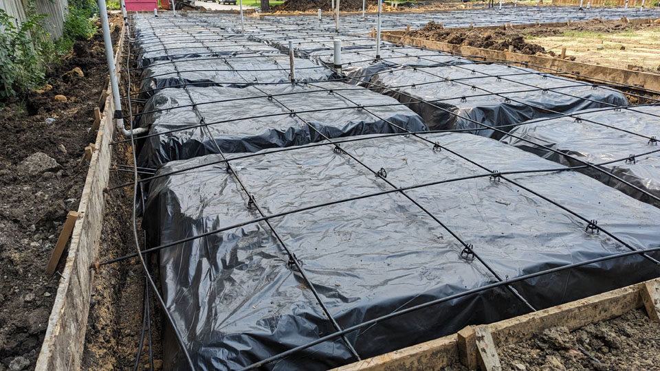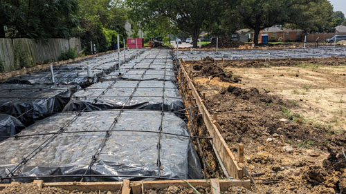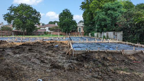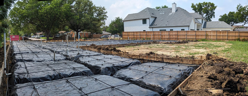 Take a look at this section of the foundation preparation. The earth has been dug out between ten-foot-square sections. The ten-foot sections have been taken down maybe six or eight inches on their tops, and then down about two feet between the sections. The earth sections have been "wrapped" in heavy plastic. Then a grid of rebar has been placed over the entire area, with another long rebar element down in the "trenches" between the earthen mounds.