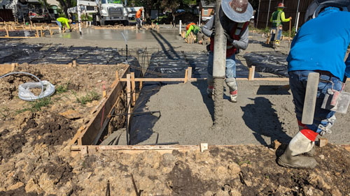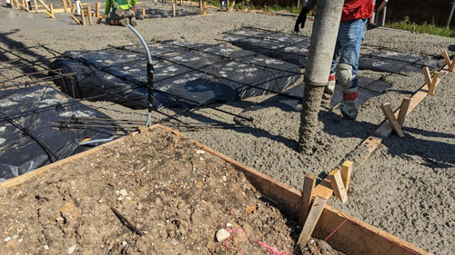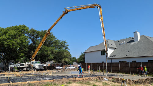 I was actually alerted to the activity today when I heard the diesel concrete trucks on Robin Road behind me. I looked out my window and saw that the pouring process had begun. A specialized truck has been brought to the site. It is essentially a reservoir with a pump and long, extendable arm that extends out over a foundation. Again, I'd not seen this process before, but it is used in situations where normal concrete trucks can't get close enough so that their own little chutes can get the concrete to where it belongs. The normal trucks discharge their loads into the reservoir, and the specialized vehicle takes it from there.