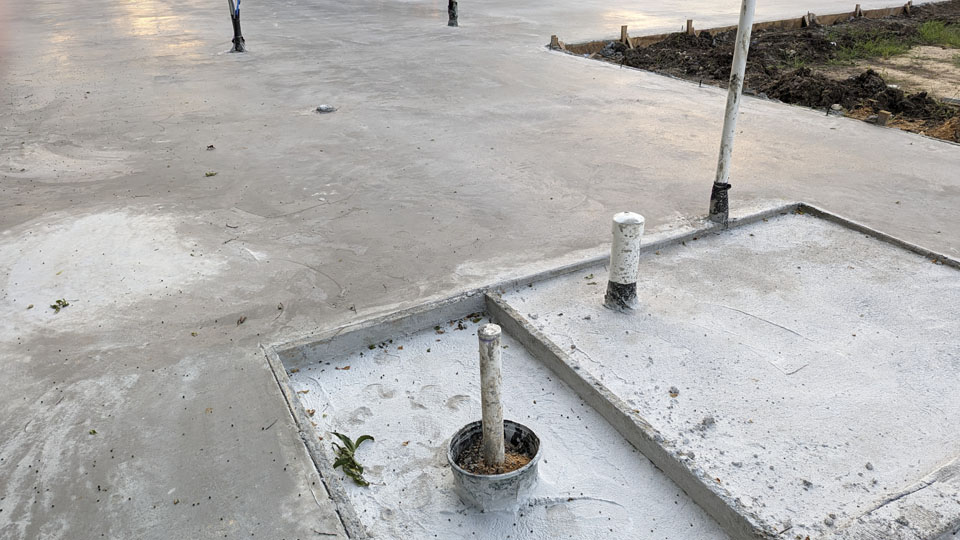 If you look at the first (left-hand) picture above, you will see two flat depressions in the foundation, each with a pipe or two sticking up through it. You can see here a close-up of this section. At the time, I had no idea what this area was for, although it looked like the preparation for a shower or something. Much later, when I was able to walk through the framed house, I discovered that a family room fireplace would be about in this spot, but I still have no idea what all the pipes are for.