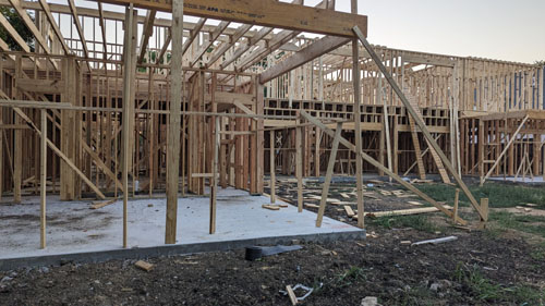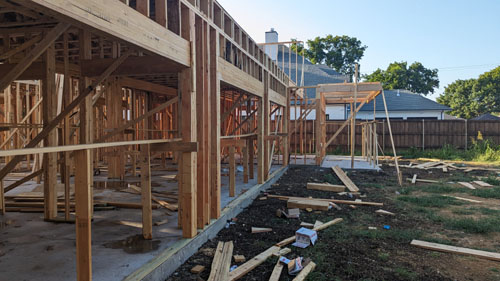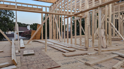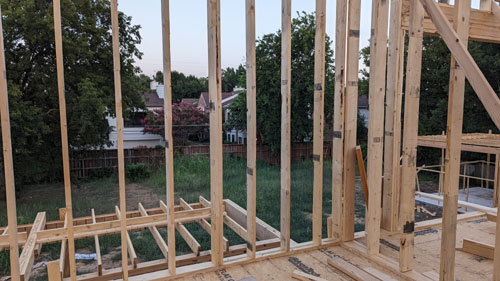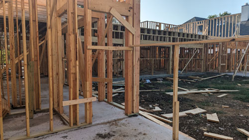 In addition to the pictures I tried to take each day, I occasionally went through the gate in our fence onto the property itself. I was very interested, for example, to see how the foundation for such a large house would be laid, what with all the piping and wiring that would eventually be sealed into that slab. Then, when the house was framed, walls went up, and interior spaces became more clearly-defined, I sometimes went over (now taking care to do so when workers were not present after the builder put up a fence at the front of the property) to walk through the house and take pictures. I'm not sure if the builder or the new owners (which I've seen occasionally from my windows) are aware of our gate, or maybe it just doesn't bother them if someone walks through the house under construction.