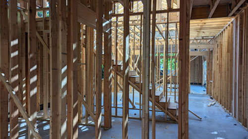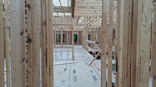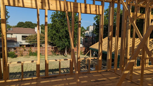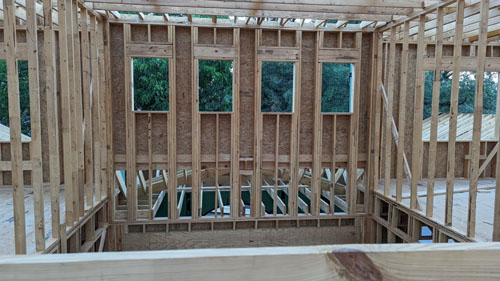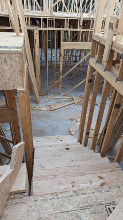 Above is a view from the top of the main stairs that looks across what will be a double-height entry towards what will apparently be a front second-floor bedroom. |