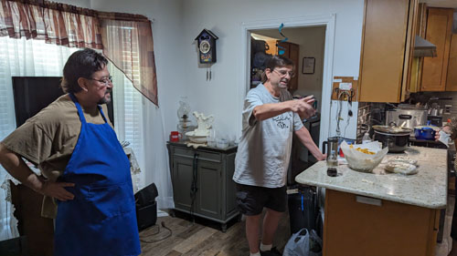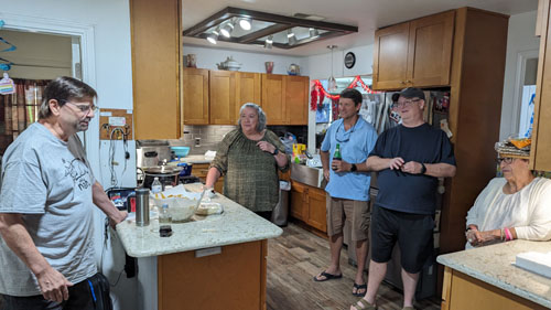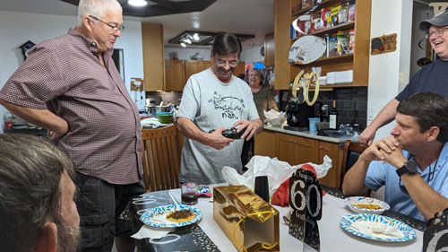 Ron's 60th birthday is actually on August 1, but the Saturday before Jay invited Fred and I, along with a number of Ron's workmates, to surprise him on his return from seeing family in Oklahoma. When Jay heard the garage door go up, he got us all to be real quiet- until Ron walked into the kitchen from the garage. As you can see in the movie below, Ron was indeed surprised!