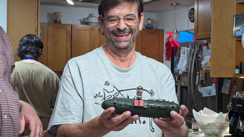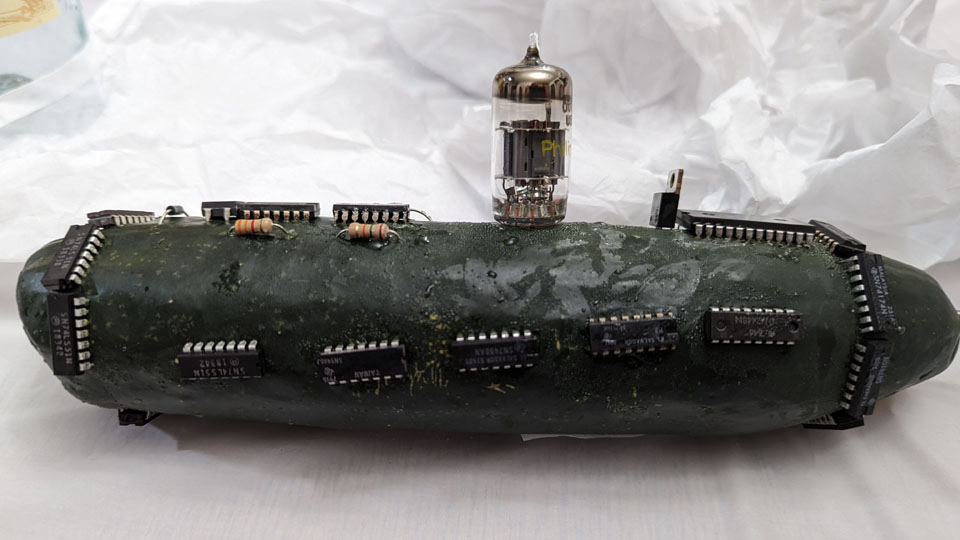 One of the gifts one of his engineer friends gave Ron was a submarine- made from a cucumber and a bunch of electronic parts (that's what Ron does- he is an electronics engineer). If you can't see the sub clearly in the picture above, right, you can see a close-up of it here.