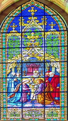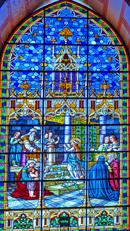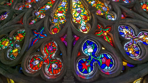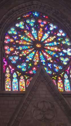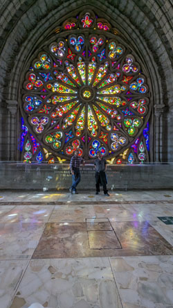 Today, the weather was much better outside, and I think that the bright sun showed off the stained glass to better effect than when we were here with Jeffie. So on this page, I want to concentrate on the stained glass. I have taken another picture in each chapel, but this time just of the stained glass, and I have put those pictures of the beautiful glass works in a slideshow. That slideshow is at right.