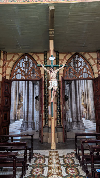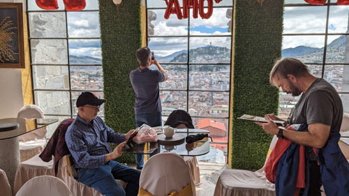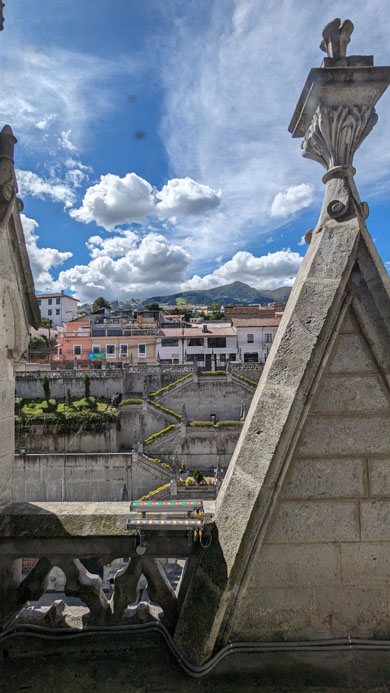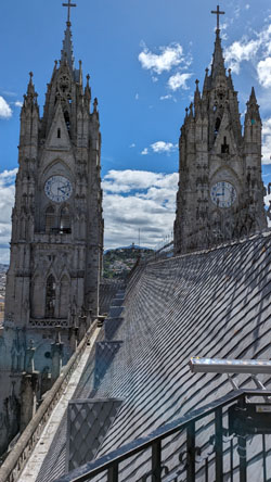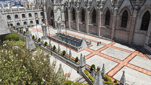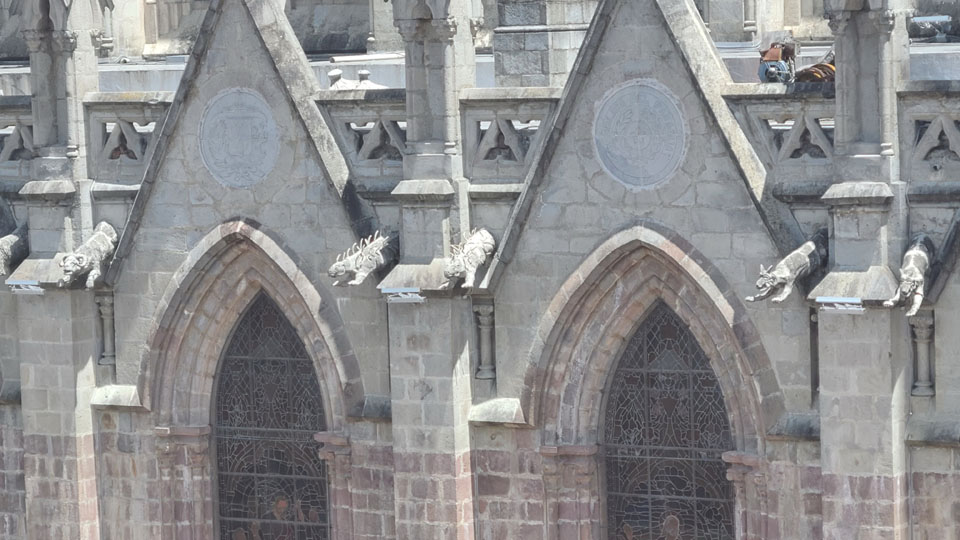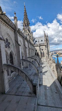 There are stairs and an elevator, so we took the latter to the third level of the tower. Here there is a cafe, a closeup of the front rose window, and the pathway across the roof of the nave to the tower at the other end of the church. There was also an open area with good views out across Quito.