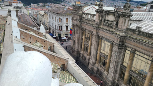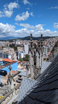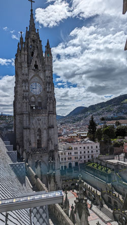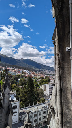 I'll come back to the Rose Window in a moment, but for now we took the stairs up another level to find ourselves on the level that has us behind the clock faces (there are faces on three sides of the tower). Before we look at the clock, there was another outside area that offered spectacular views out over the old city of Quito: