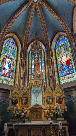 I thought that the altar and the stained glass windows behind and around it were extremely beautiful, and both Fred and I took a number of pictures of it. Fred took an excellent picture of the alter (left-hand picture below) and I got a bit closer to take two pictures that I then stitched together (the right-hand picture below):