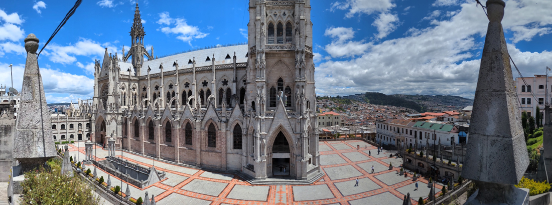 Again, this next panorama takes in the Virgen el Panecillo, but it looks more south/southeast along the roof of the nave of La Compania. That is the Museum of Money to the right.