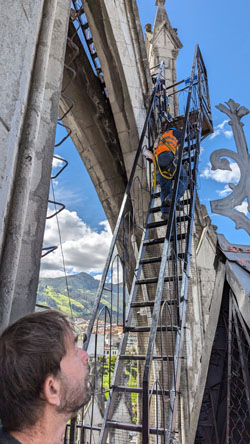 Eventually, it was our turn to climb the two flights of steep stairs to the upper platform, and the views (as we thought they might be) were really neat. Take the picture below, for example, looking across the church roof to the front clock towers (stitched together from three separate photos):