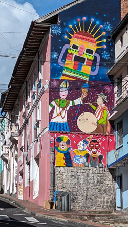 Oddly enough, just as our Uber was leaving the Paseo San Francisco to head around the traffic circle and back down southwest to connect up with the highway that goes to Quito, I looke just ahead of us at the stoplight, and simply couldn't resist taking a picture of the truck ahead of us. If you will look closely at this Ecuadorian-licensed vehicle, you'll see a bumper stick on the left of the tailgate. I would love to know the story of how the driver came to put it there. We don't take this southern route to Quito often, unless we are going to the old city, but on the way into the city I snapped this picture of a new tower with a mosaic on the side of it. The utility lines spoil the picture, but they are ubiquitous in Quito.
