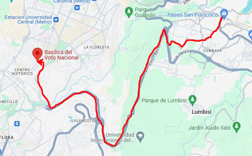 Now, we are going to head to the east corner of the square (near where the yellow taxi is in the right side of the panorama, for there we will find the entrance to the Quito Metro, which we want to ride on. The Quito Metro is the underground underground railway network that serves the city; it was inaugurated on December 21, 2022, although several technical and operational problems delayed the debut of its commercial transportation operations until December 1, 2023- just two months ago!
