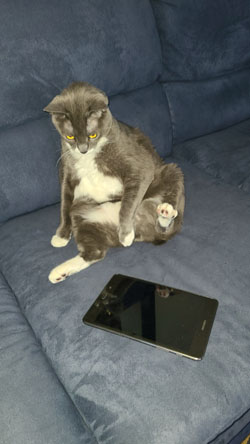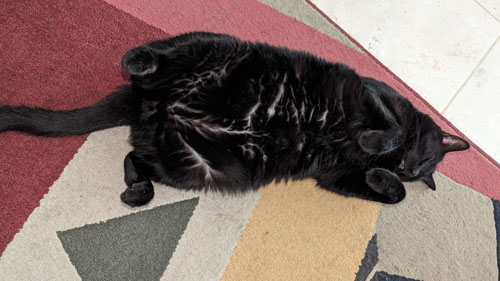As for Cole, he has his own characteristic pose, which we affectionately call his "dead kitty" pose. He will lie in the middle of the rug, balanced on his back, with all four of his feet in the air. We've seen other cats in this pose on the Internet, but not many and not nearly as often.