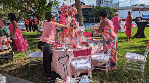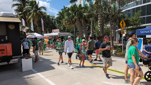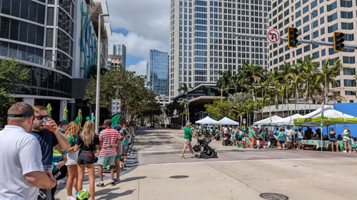 When we could hear the parade units firing up right around 11, we went to find a place we could stand. About midway down the block of Las Olas east of the Tunnel Top Park we found a place behind the barriers that was thinly-occupied, so we got some spaces on the rail and waited for the parade units to come by.