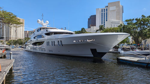 We have actually seen bigger yachts than this one, and yachts that are more extensively outfitted, but this one is pretty nice. We've learned that very few of these very big yachts are actually owned by used by individuals; almost all of them were purchased by consortiums who charter them out. Chartering a yacht like this one can easily run north of $100,000 a week- plus some expenses. Since I'd come upriver to see it, I made a couple of movies, too.