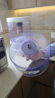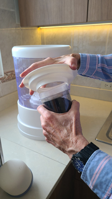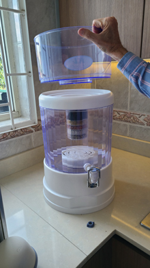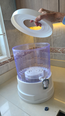 Below this upper reservoir is the larger reservoir that contains the filtered, treated water. Hanging down from the upper reservoir is a seven-stage filter, comprised of layers of filter material, each of which focuses on one or another impurity. I don't know exactly what they all are, but taken together they make the water drinkable and unlikely to cause any digestive problems except in the most sensitive of people. The water filters down through this system very slowly, entering the bottom reservoir at a steady but only moderate drip. Eventually, the water in the lower reservoir touches and then rises above the bottom of this filter, but fluid dynamics being what they are, the filter continues to work until the water in the upper reservoir is exhausted or the bottom reservoir is full.