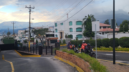 The exit is only clogged at rush hours, as it empties out right onto Avenida Oswaldo Guayasamin, and right where it enters the large traffic circle just northwest of the mall. Because there is a light where the Avenida enters the traffic circle, the traffic on that main street backs up down past the mall, and this would basically keep cars exiting the mall garage from merging onto that street. Because of this, one of the mall's security personnel is usually stationed where the exit enters the avenue, and he stops traffic on the avenue as necessary to allow cars leaving the mall to merge onto it. When we take the walkway you can see in the picture, to go behind where I am standing and up towards the circle, we often have to wait until the traffic on the avenue is stopped at the light and so the traffic leaving the garage is also stopped to go between the cars. But this is usually only around the end of the workday.