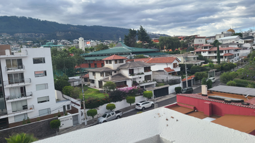 These views can be really spectacular on clear days, when the sunlight and clouds cast shadows on the hills in the distance. Incidentally, we can't really see Cotopaxi from here; the best views of it are from up in Quito, because here the hills and trees block it. Sometimes we can see it from the pedestrian overpass on the other side of the mall. Here are two more pictures looking down the street towards our gates: