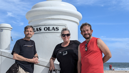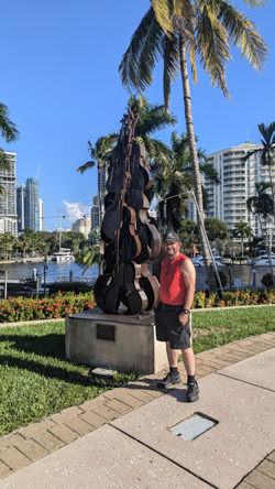 We crossed A1A and this brought us to the main entry plaza for Fort Lauderdale Beach. There are other entry points north and south of here, but this is the main one, and it usually decorated for various holidays. We had an obliging passerby take a couple of pictures of us at the entry plaze: