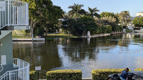 The final pictures that we took on this trip were actually the day before we left. The occasion was a "King Tide." A King Tide occurs when there is an abnormally high tide when the moon is at its closest to the earth at the time of a normal high tide. This occurrence accentuates the tidal effects, and in the two pictures below you can see that the park across the river and the back yard of the white house directly across from us are partially submerged: