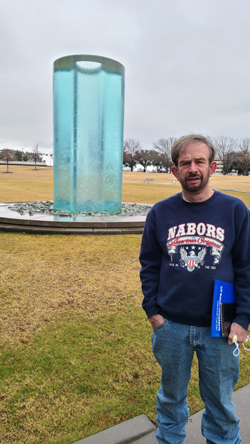 The tall blue lucite structure is actually a fountain. It's running, but if it gets any colder untreated water will freeze, and that can't be good for the fountain itself.