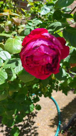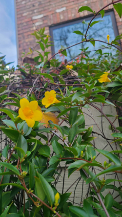 Thanks to Fred urgings, I have had a trellis for a couple of years behind my garage, intending to mimic that of my friend David, who has a unit like mine at the other end of my building. He erected his about five years ago, and for the last three years or so his 'Jane Austen' climbing rose has covered his trellis completely, and thus in the spring his garage is framed by beautiful pinkish-red blooms. The rest of the year, the greenery is almost a nice to look at.