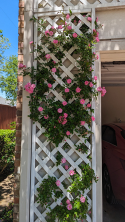 Anyway, they are blooming now, I want to include some pictures of them here. At the left and right are a couple of vertical pictures of the roses on the left, shadier side of the garage. Below is a photo of the right side of the garage trellis, showing the same rose variety (mixing in with a different rose that my next-door neighbor, who put up a trellis also, has). The top trellis has not yet gotten significantly covered from either side, and I doubt the left side will every crawl up that far.