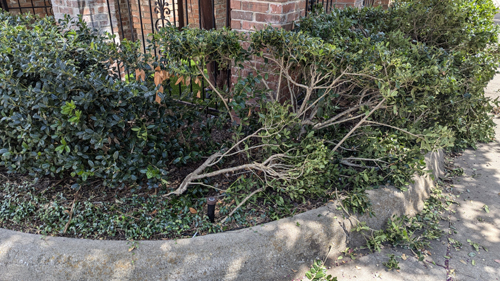 Here are a couple of photos of interest only to me. Another resident was having a delivery from Lowes. They weren't sure where in the community she lived, and their truck (according to my neighbor, Floyd) came up in front of my townhouse, and when they realized the address they were looking for wasn't accessible from the front of our community, tried to turn in front of my unit to go around my unit and back out to Inwood Road. But their truck was too big to make the turn, and when I heard Floyd yelling at someone, I came out to see what was going on. What I found was that the truck was just turning behind my garage to go back out to Inwood, and what they had done is run over all the holly shrubs at the front corner of my townhouse: