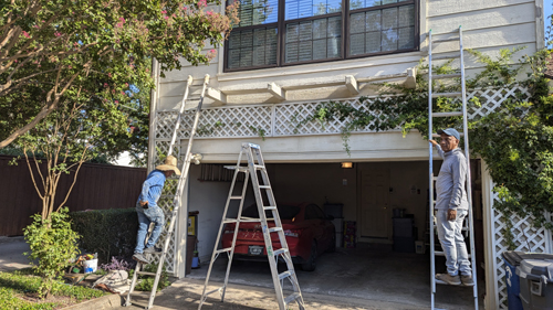 This morning, my carpenter is here to take down the window ledge above my garage. I suppose that this feature was added by the developer to units like mine to provide architectural interest, but to my knowledge no one, including me, has ever put anything on the structure; too hard to water, I guess. In fact, every other homeowner with a unit like mine has had these shelves removed already, so now it is my turn.