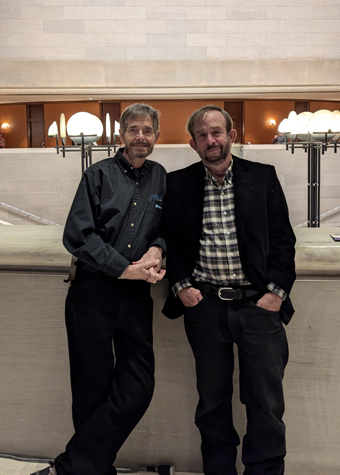 At intermission this evening, I had a fellow concertgoer take a couple of pictures of Fred and me spending our intermission people-watching on the bridge.