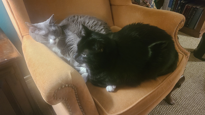The summer and fall were very busy, and although the cats were all with us throughout the summer, and a couple were with us in Florida in November, we didn't have an occasion to photograph them, until December rolled around and we took our last pet picture of the year. At it turned out to be an unusual picture of Bob and his nephew Cole occupying the same chair: