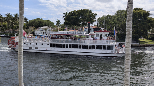 As you come down into Old Fort Lauderdale, there is a lot of greenspace along the river, and you can get right up to the riverbank for good views. As we were doing that, the bridge that carries the FECR/Brightline over the river came down, indicating that either a Brightline train or a freight train would be coming across the river.