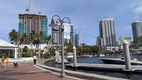 In the picture at left, I am standing in Laura Ward Park and the picture shows where the walkway begins that goes behind the Stranahan House and the Icon Las Olas, and is actually out over the water of the New River.
