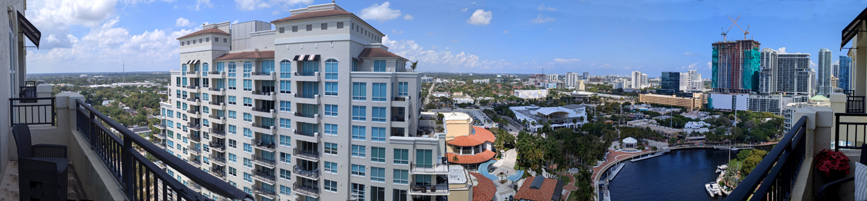 The other thing we did towards the end of our visit was to take some pictures from Bruce's balcony. Being on the north side of his building, he has excellent views to the west and north, of course. He can even see to the east. Sailboat Bend, the Performing Arts Center, the Science Museum, and the Esplanade are right below, and he is high enough that the north tower doesn't block too much. To begin, here is a panoramic view: