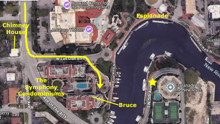 But it wouldn't be at his house south of me; in the intervening years his kids had grown up and moved away, he had semi-retired, and he and his wife had moved to The Symphony Condominiums. Fred and I knew exactly where he was; our strolls on the Riverwalk always ended up at the Broward Performing Arts Center west of the Esplanade, the The Symphony is just south of the Broward Center. At left is an aerial view of Sailboat Bend- the area where our walks end. I've marked the Esplanade, and in a section above you saw some photos we took on one of our walks there.