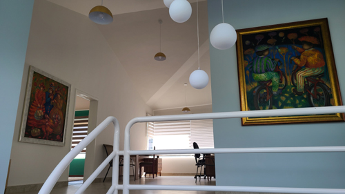 The Tumbaco Valley Bridge Club has arranged to have its games in what appears to be a kind of recreation space on the second floor, just up one flight of stairs.