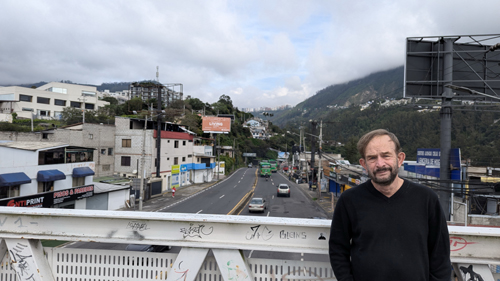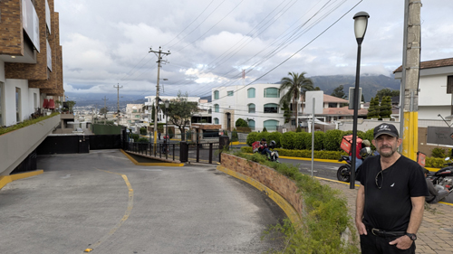 At right, Fred is standing at the top of this same ramp, and behind him you can see the road to Quito (one of them, anyway, this being the road that leads up to the tunnel).