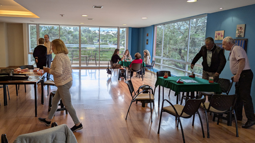 The Club stores all its equipment in that kitchen area, and the first people to show up can help with moving the card tables around, putting green tablecloths on them, getting out the plastic "boards" that contain the four hands of cards, opening up the bidding boxes that are used in lieu of verbal bidding, and shuffling the cards to create new hands from the last time the boards were used. I learned that someone also usually brings something like cookies or some sort of light snack, and these are set out on the counter between the kitchen area and the open space. People often stop at the snack bar of the hospital (which is just across the driveway from the main entrance to Rivera del Rio) to get drinks if they want them.