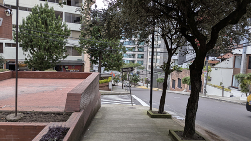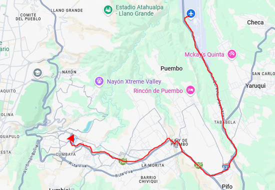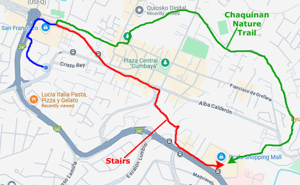 On the aerial view at left, you can see the route we usually follow to get there, circling around Paseo San Francisco, heading down Maria Idrova, and then heading south on the private street that ends in the walkway/stairs down the hillside, past the public swimming pool, and then up to Oswaldo Guayasamin, the main street that runs by Scala Mall.