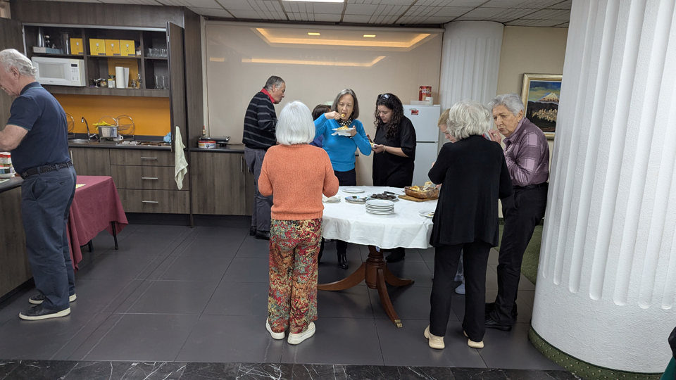 Taking a break is not unusual, but here someone actually brings some sort of casserole or sandwiches along with a dessert of some kind, and the break is twenty minutes or so. The club apparently employs a lady who runs the kitchen area; she makes the coffee, sets things out, and cleans up when the session continues. No such person is at the Wednesday game, but then here in Quito the club owns the space they are in.
