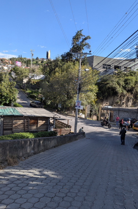 As you saw in the movie, the walkway and stairs end at the top of a street that comes up the hillside from Avenue Oswaldo Guayasamin. There has been some new construction here, and the street where the stairs dump you out is quite new.