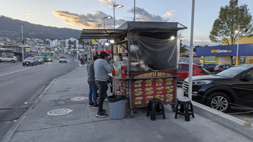 Plaza Cumbaya also has a number of stores that we visit frequently, including the equivalent of a five and dime, a big hardware store, our main bank, Hornero Restaurant, and an ice cream shop with local flavors. Coming east and going around the corner to the north, are Taconazo (Mexican) and Rusty's Burgers, two other eating places we frequent.