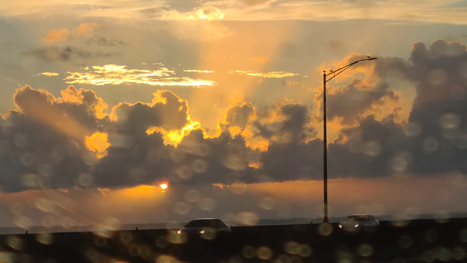 The only pictures from the trip home were taken by Fred (as I was driving) as we crossed Mobile Bay. Just before we reached the Bay it began to sprinkle, which marred Fred's picture of the sunset over Mobile Bay, even though I'd run the windshield wipers just before he took his picture.