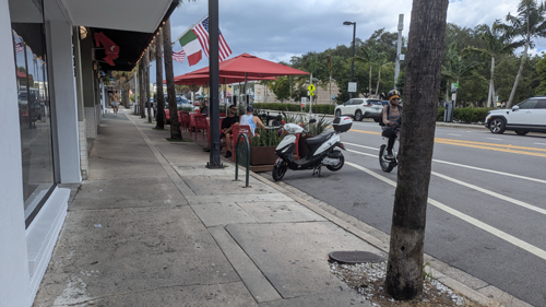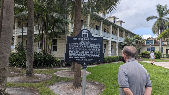 As you can see in the aerial view at the beginning of this section, the Riverwalk comes around the south side of the apartment buildings, heads north a few feet, and then crosses the tracks of the Florida East Coast Railway (and the Brightline commuter train). On the other side of the tracks, the walk comes down from the railroad embankment into an area known as Old Fort Lauderdale.