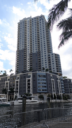 So the Riverwalk continues to follow the north shore of the New River, eventually passing under the Third Avenue drawbridge. Just before it goes under this roadway, there is a construction site on the north side of the street. We have seen in the last year or so the demolition of the small professional building that was on the site, the construction of a major foundation, and the erection of a new condo building- The Gables Riverwalk. This new building, which has now topped out, is currently Fort Lauderdale's tallest building at 47 stories. It may hold that title for a year or two, but there are taller structures planned or under construction.