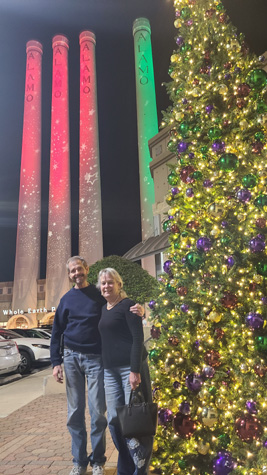 (Picture at left) On Tuesday night, Prudence took us to Piatti, an Italian restaurant in The Quarry Market. As we were walking back to our cars after dinner, Fred took this picture of Prudence and I with the original quarry smokestacks (lit up for Christmas) as a backdrop.